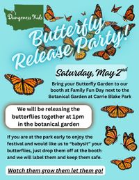 Still want to grow your own butterflies for our Butterfly Release Party on Saturday, May 2nd? It's not too late. We can still add to our order of Caterpillars that are arriving on April 2nd. Buy a butterfly garden kit AND a cup of 5 caterpillars and we will add it to our order.
